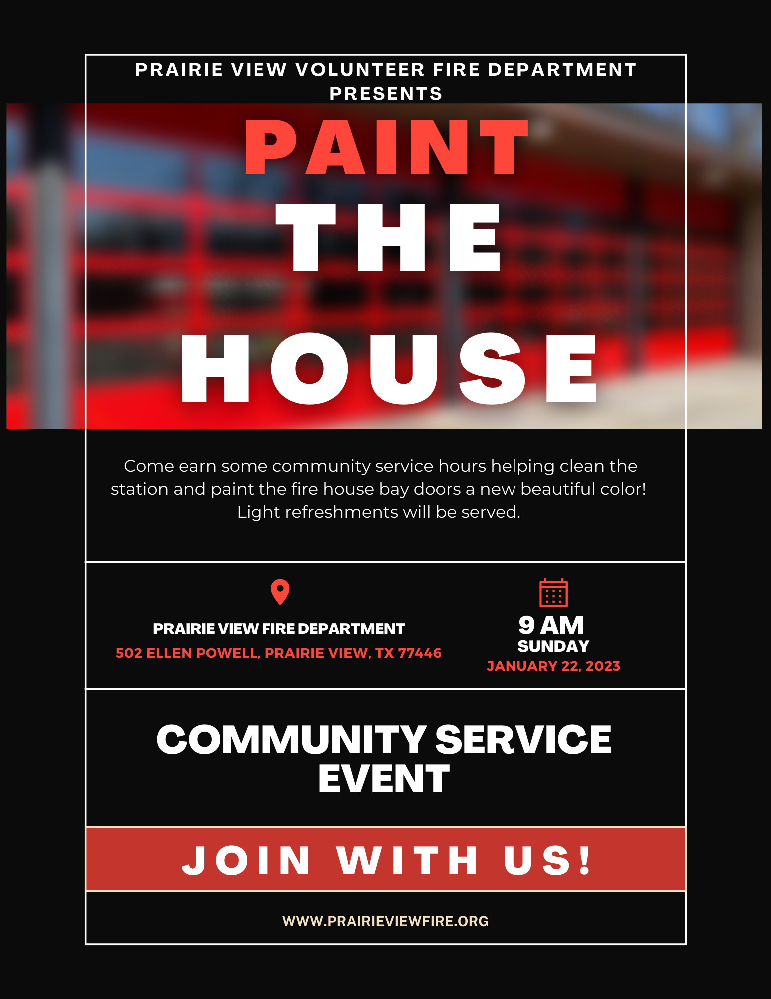 Come earn some community service hours helping clean the station and paint the fire house bay doors a new beautiful color!